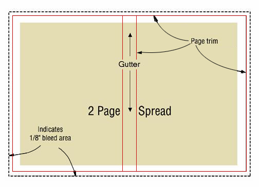 Two-Page Spread: this is a page design that spans both right and left-hand pages. The pages are centered at the gutter where they are bound into the spine. Approximately 1/4″ of the spread will be bound into (and thus hidden within) the spine. This, in of itself, is not a problem, but it does require a bit of special attention when using an external tool, such as Adobe Photoshop® to create page design.