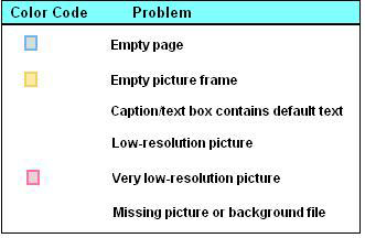 The color of the arrow indicates the most serious of the problems within the book. Placing the cursor over a coded-color error box will display a page’s problems, and allow you to go directly to the page to make changes.